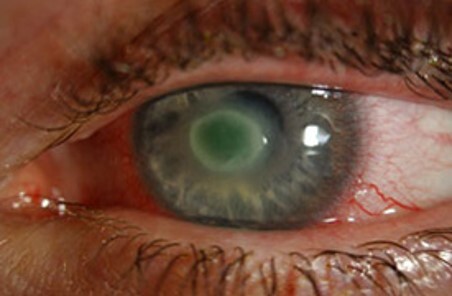 Your YN2 comes up to complaining of OD pain you note tearing of his R eye, and a 20/50 in his R eye and 20/20 in his left. Also you seen discomfort in your patient when you shine a light into his R eye. he also wears contacts.