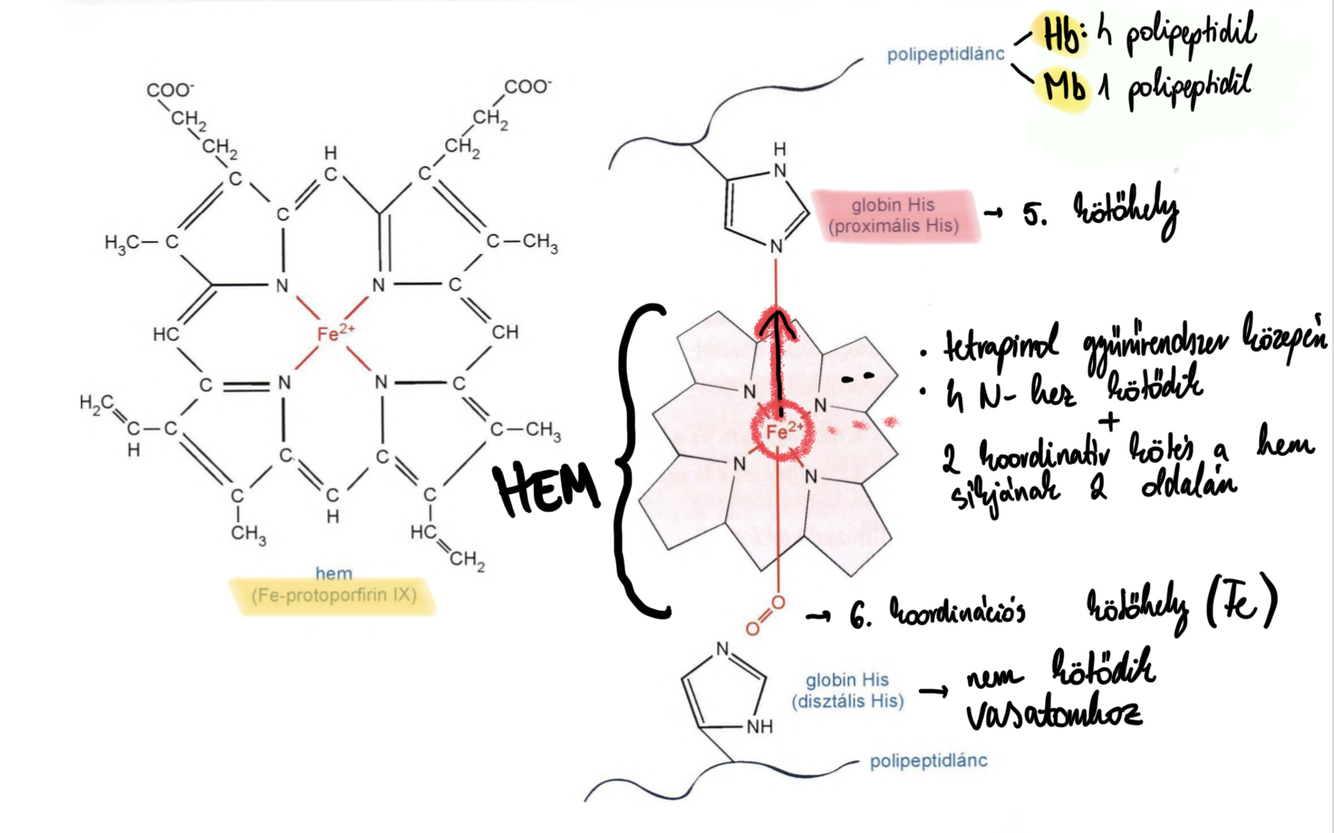 ♦Fe2 -állapotban O2-t köt, illetve transzportot bonyolít le (Hb, Mb); a Mb, illetve Hb oxigénkötése