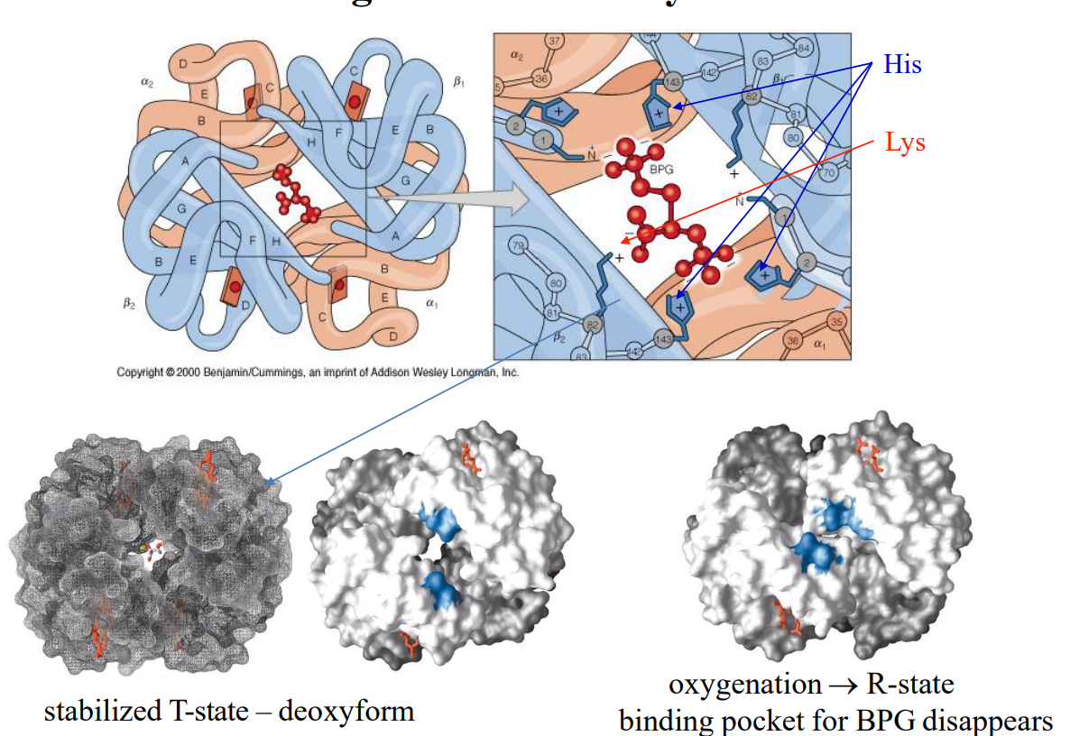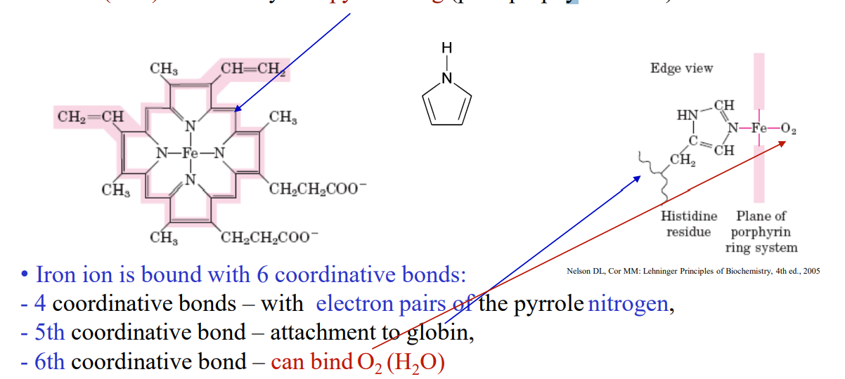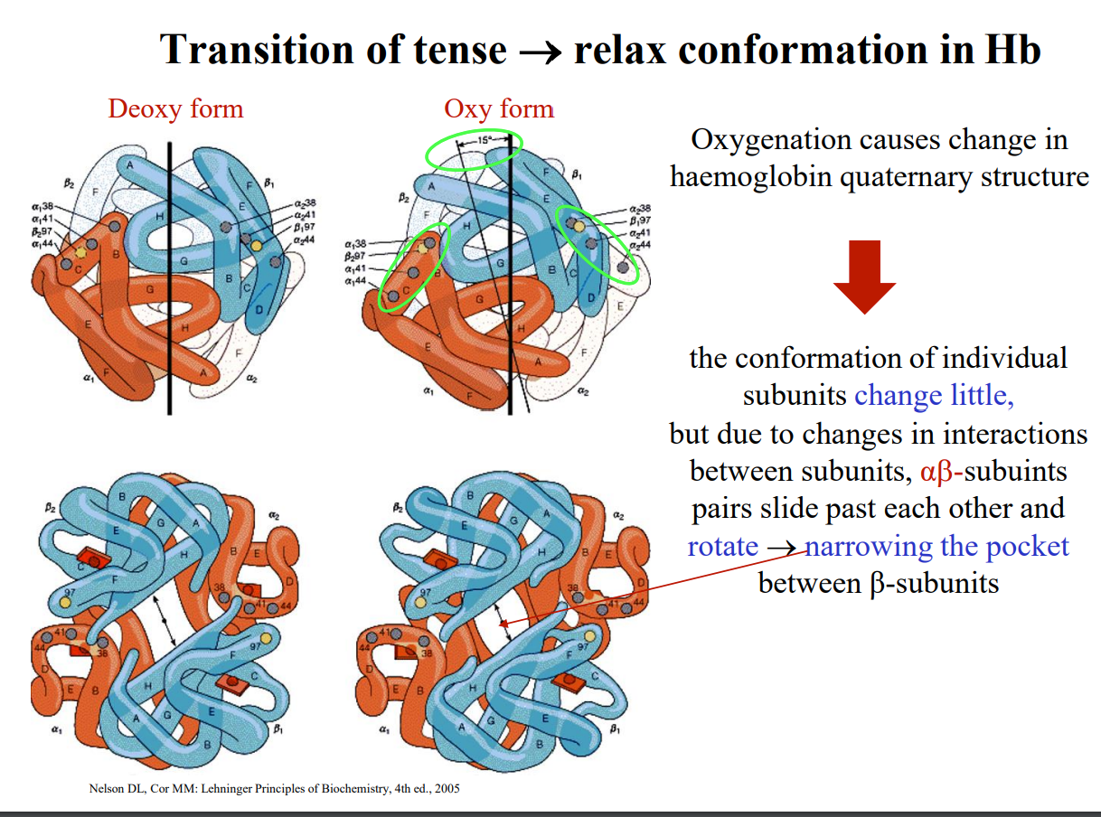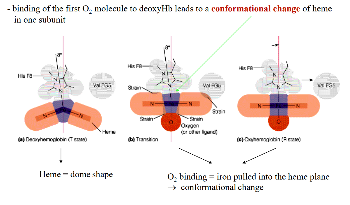 The binding of O2 to deoxyHb causes conformational change in the heme: