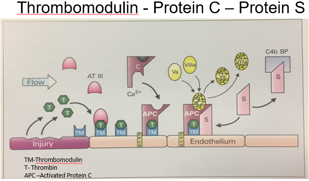 Describe how thrombomodulin works. What are the roles of Protein C and S?