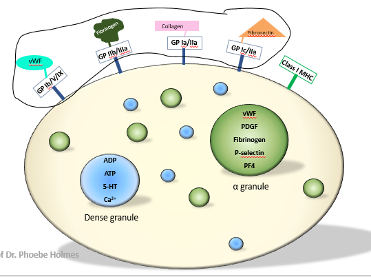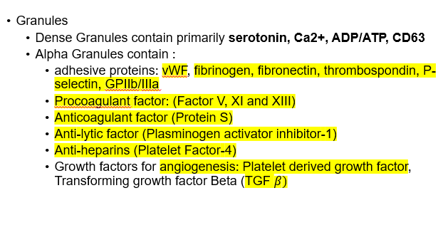 alpha granules contain von-Willibrand’s factor, platelet derived growth factor (PDGF), P selectin, fibrinogen and fibronectin, TGF-B, PF4, Protein S, PAT 1 and procoagulant factors