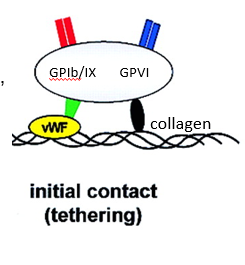 The 2nd step in forming a blood clot is platelet adhesion, which is mediated by vWF (bound by GPIb/9) and collagen (GP6) that are in the subendothelial matrix. Both of these help to tether the platelet to the damaged vessel