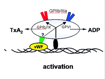 Platelet activation and degranulation are mediated by GPIIb/IIIa whose conformational change exposes the binding sites for vWF and fibrinogen. ADP and thromboxane (platelet agonist) are also released