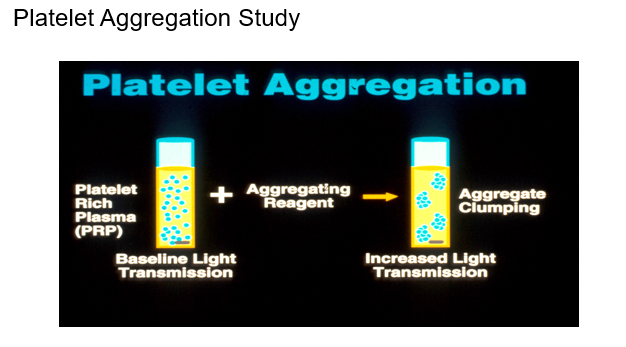 Platelet aggregation study: Platelets in plasma >> measure baseline light transmission >> + platelet agonist >> wait for clot to form then measure second light transmission >> difference between initial and final transmission = amt of platelet clumping = degree of platelet function