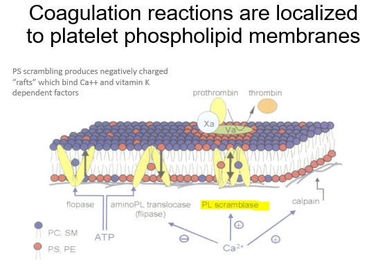 Calcium has a net + charge; PL scramblase creates negatively charged phosphotidyl serine rafts that bind to one of calcium’s +ve charges, and the coagulation factors (also –vely charged, can bind to the other +ve charge)