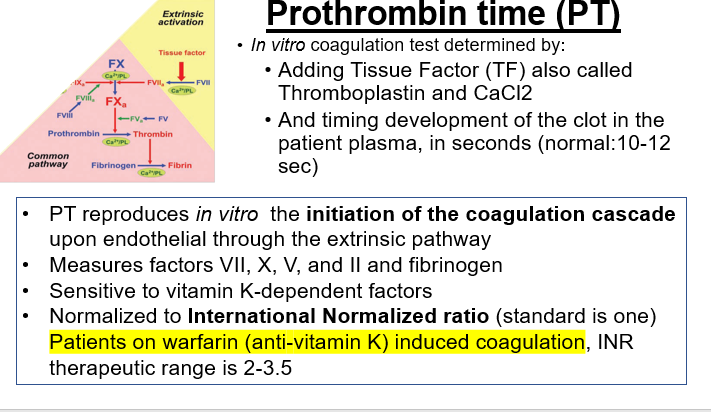The prothrombin (PT) time test measures the activation of which pathway of thecoag cascade? Which factors are being measured in the test?
