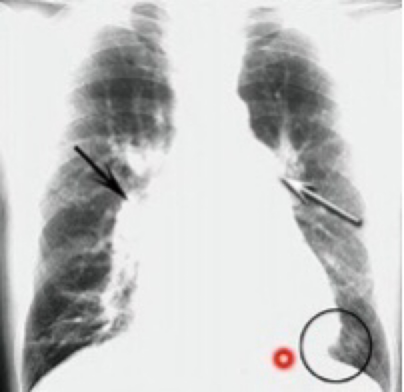 Tronco pulmonar proeminente (seta branca) + dilatação da artéria pulmonar direita (seta preta) + “coração em bota”, evidenciando aumento de VD (círculo preto).