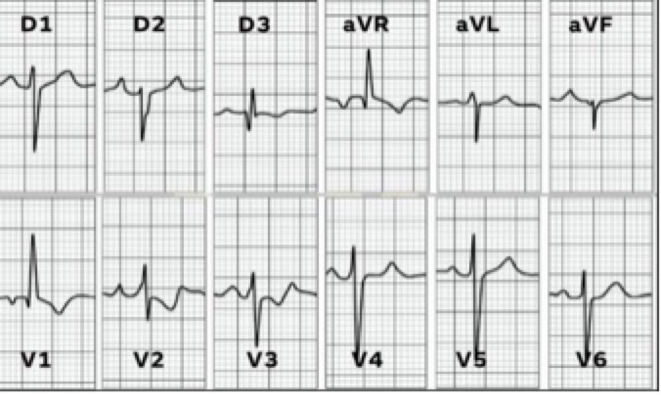 Sinais de sobrecarga de VD -> onda R em V1 proeminente + onda S proeminente em V6 + QRS para a direita (D1 e aVF negativos) + onda P apiculada/ onda P pulmonale (em DII e V2).