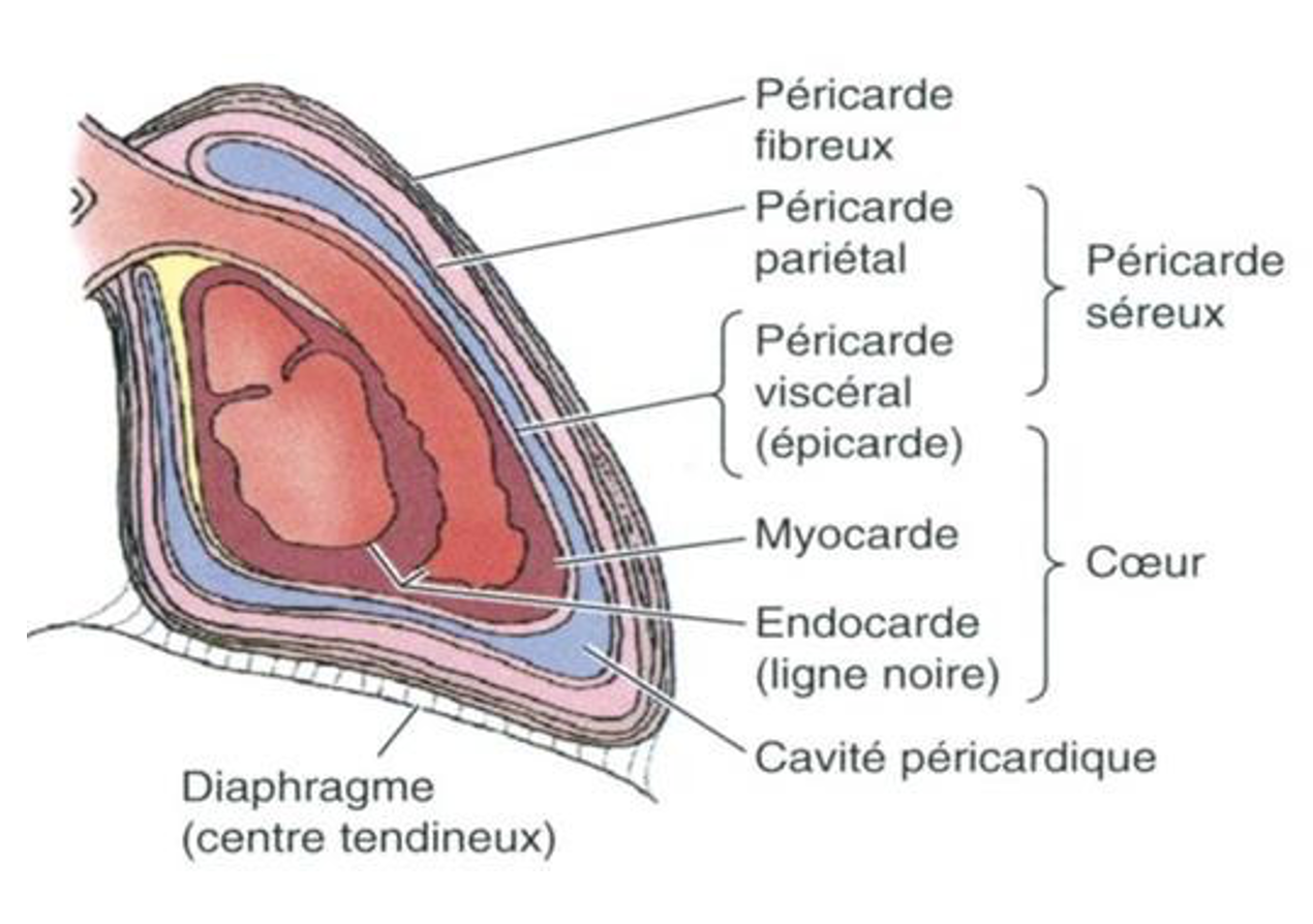 le feuillet séreux pariétal et le feuillet séreux viscéral. Le feuillet pariétal tapisse l’intérieur du péricarde fibreux alors que le feuillet viscéral recouvre directement la surface du cœur.
