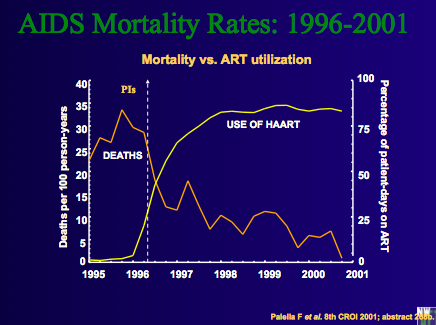 show how haart has changed mortality. After 1996 – had PIs, which changed the game. At that time, AIDS was #1 cause of death in youngmen