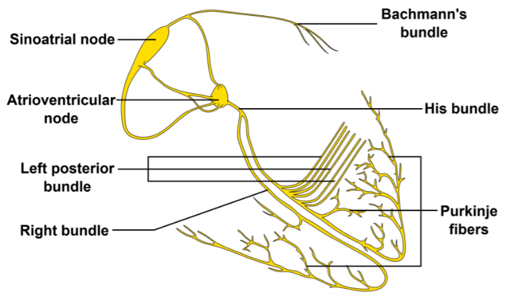 Elektrisk signal härrör från sinoatrala noden (SA-noden) Signalen sprids vidare till den atrioventrikulära knutan (AV-knutan) som leder den elektriska signalen väldigt långsamt varför signalen nästan stannar upp i c:a 0,1 s. på grund av mindre diameter på cellerna och mindre gap-junctions
