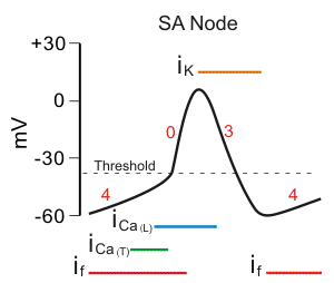 Långsammast pacemakeraktivitet (20/min och osäker) eftersom I(f)-vågen är väldigt slö men snabbare upstroke vid aktionspotenital eftersom den också nyttjar I(Na)-våg utöver I(Ca) vid depolarisering