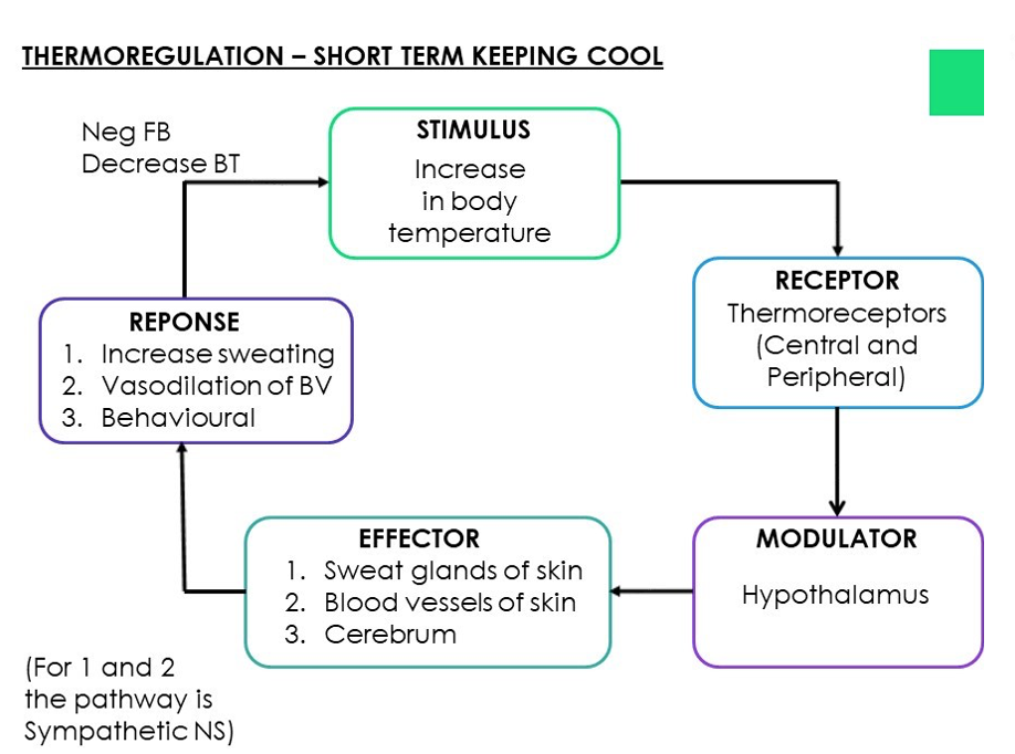 Stimulates sympathetic nerves -> Cells around sweat ducts pump sweat to skin surface -> Sweat evaporated from skin -> Cooling of skin means cooling of blood flowing through skin -> Heat loss through conduction and radiation.
