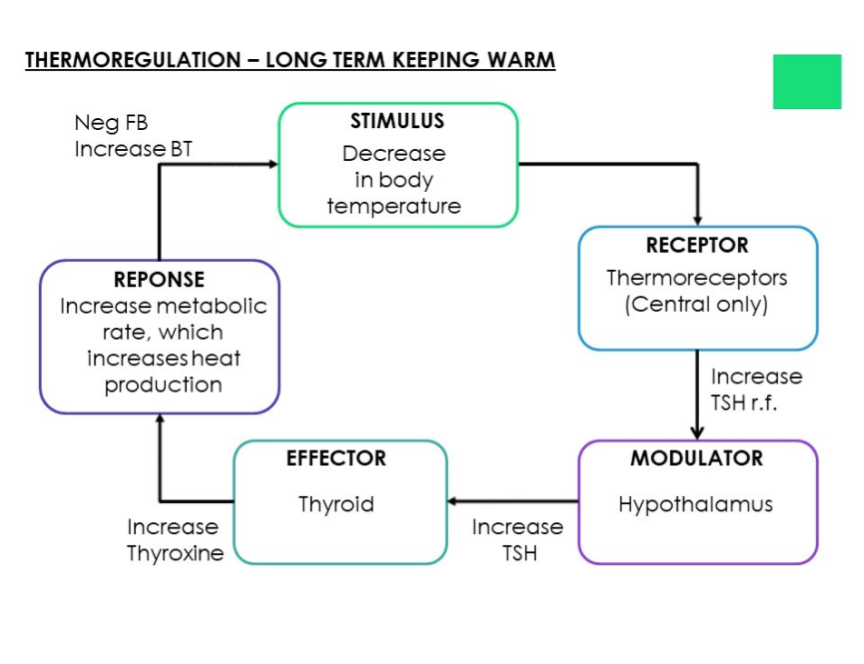Hypothalamus reduces secretion of TSH -> Thyroid decreases secretion of thyroxine -> Decreases metabolic rate -> Less heat produced.
