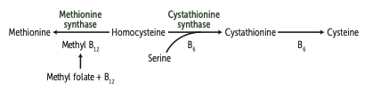 Deficiency of cystathionine synthase, methionine synthase, or MTHFR (methylene tetrahydrofolate reductase)