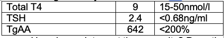 At least TT4 and TSH. TgAA would help you know whether there is a chance that your TT4 result has been interfered with. FT4d is helpful because less affected by non-thyroidal illness and free form TgAA assay interference