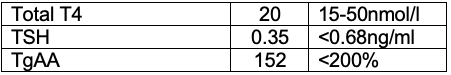 An owner of a horse has asked you if you think their horse could be hypothyroid. It is not jumping as well as it used to and they have noticed a lump in the horse’s neck at a position that they have been told is the thyroid. As part of your clinical examination you palpate this lump and agree that it is likely to be a thyroid gland.’