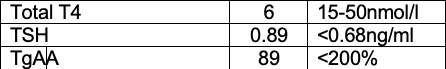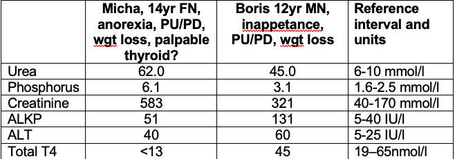 A cat with renal failure as bad as these results suggest would be expected to have a very low TT4 if they had normal thyroid gland function (like Micha) because of non-thyroidal illness syndrome/euthyroid sick syndrome. Boris has normal thyroid BUT, you would expect his thyroid levels to fall due to the severity of the illness happening elsewhere. therefore, Boris is hyperthyroid even though his thyroid value is in reference range