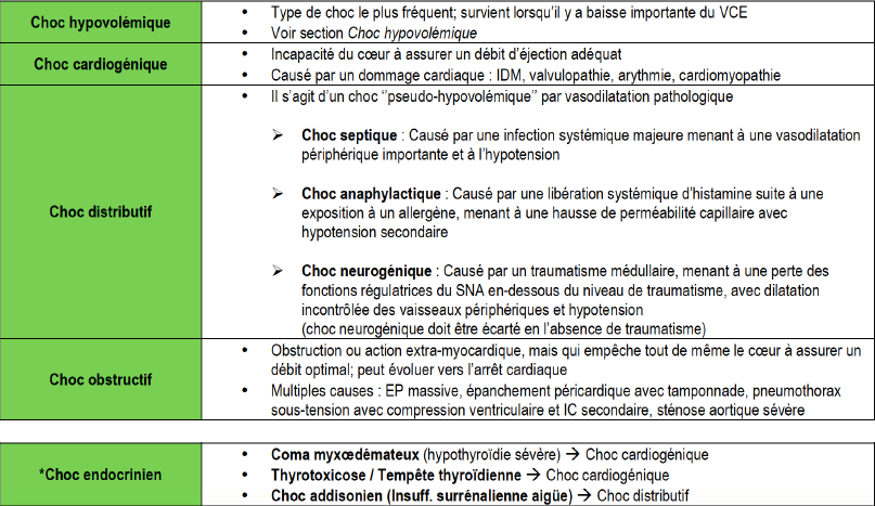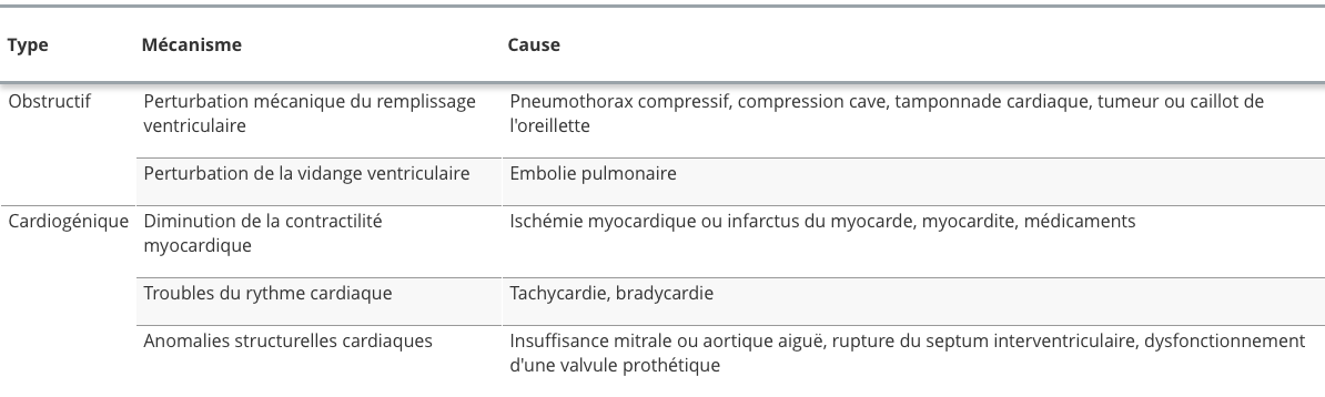 Reconnaître la cause sous-jacente du choc est plus important que catégoriser le type de choc. Le plus souvent, la cause est évidente ou peut être rapidement reconnue à l’anamnèse et par l’examen clinique, ainsi que par quelques examens complémentaires simples.