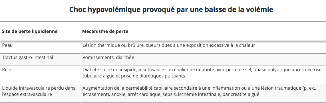 Le choc hypovolémique est provoqué par une baisse importante de la volémie. La diminution du retour veineux (précharge) provoque une diminution du remplissage ventriculaire et une réduction du volume systolique. Sauf s’il est compensé par une augmentation de la fréquence cardiaque, le débit cardiaque diminue.