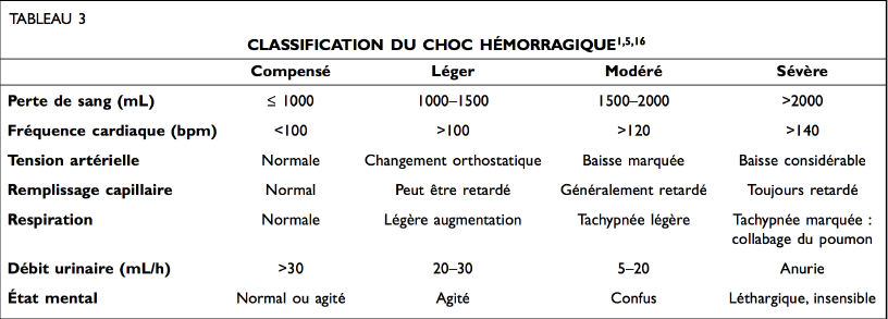 Quelles sont les différentes catégories de sévérité du choc hémorragique?