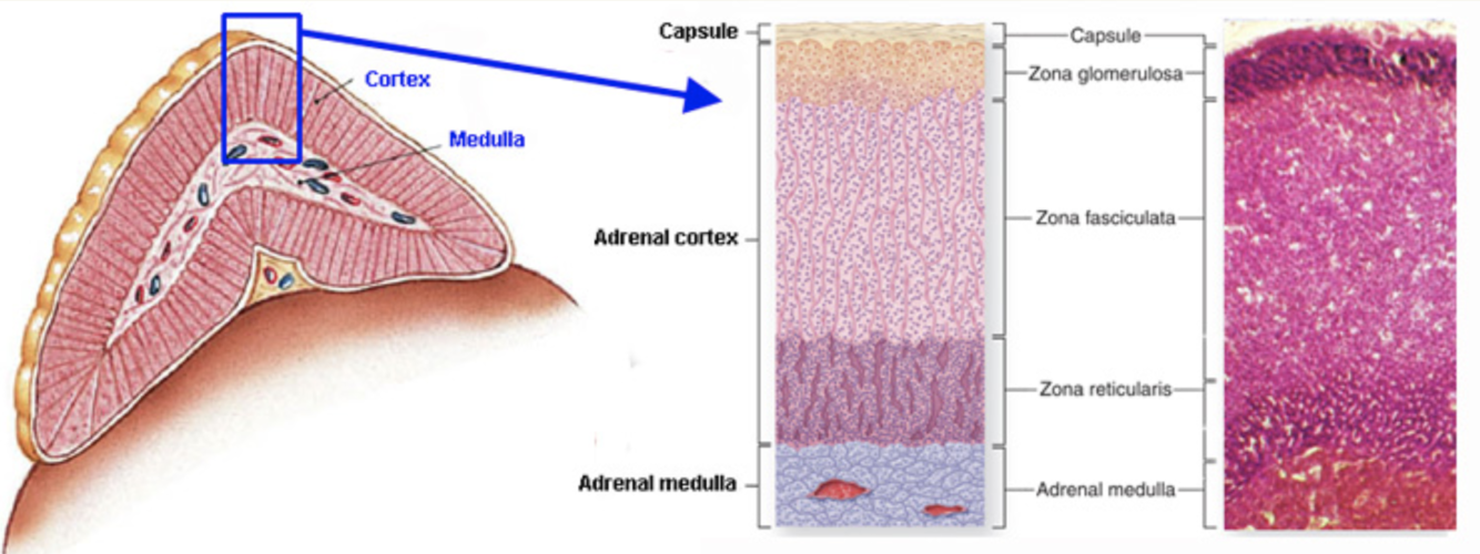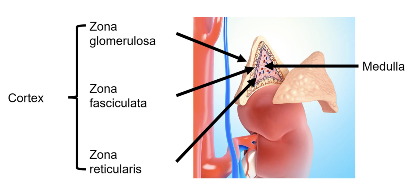 The adrenal gland is made up of 2 key parts, the adrenal cortex and medulla. The adrenal cortex can be further divided into 3 parts. Label the image below with the names provided: