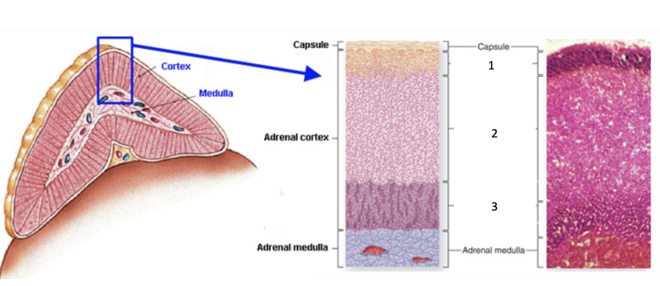 1 = zona glomerulosa (outermost layer) 2 = zona fasciculata (middle layer) 3 = zona reticularis (innermost layer)