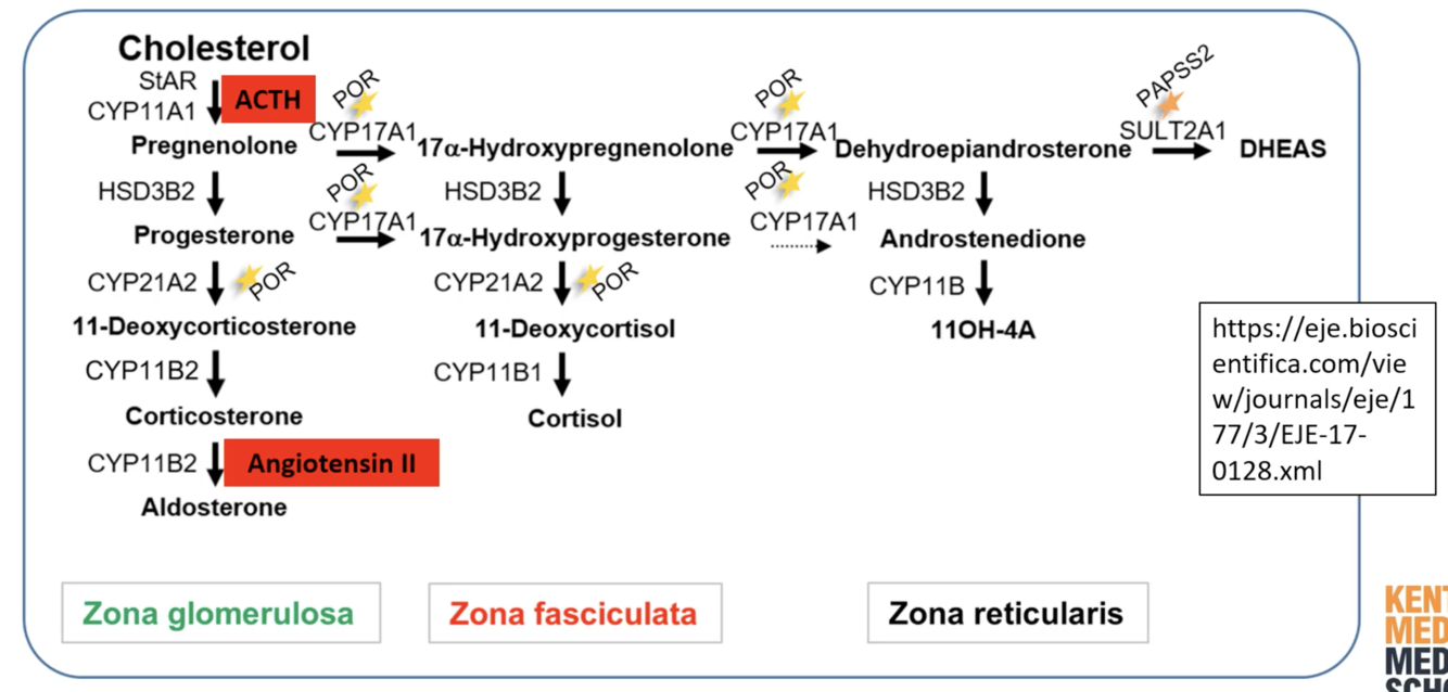The image below shows how the adrenal gland is stimulated and and then the enzymes and reactions that take place to synthesise and secrete: