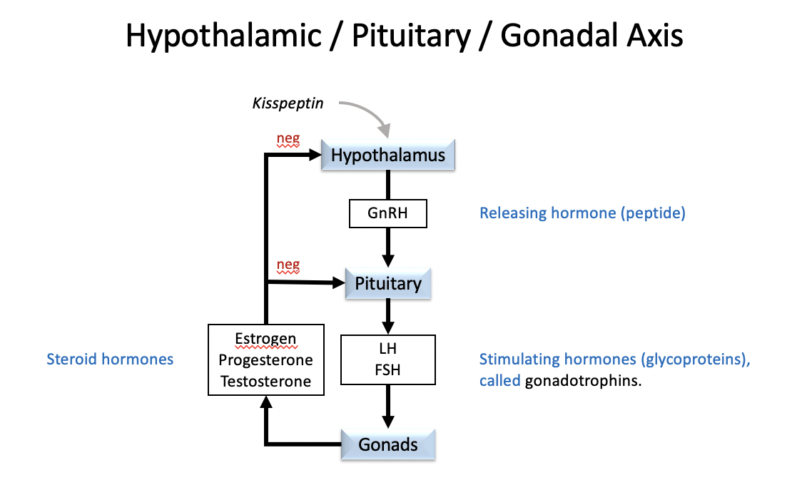 Kisspeptin acts on the hypothalamus, stimulating release of GnRH, a 10 amino acid peptide