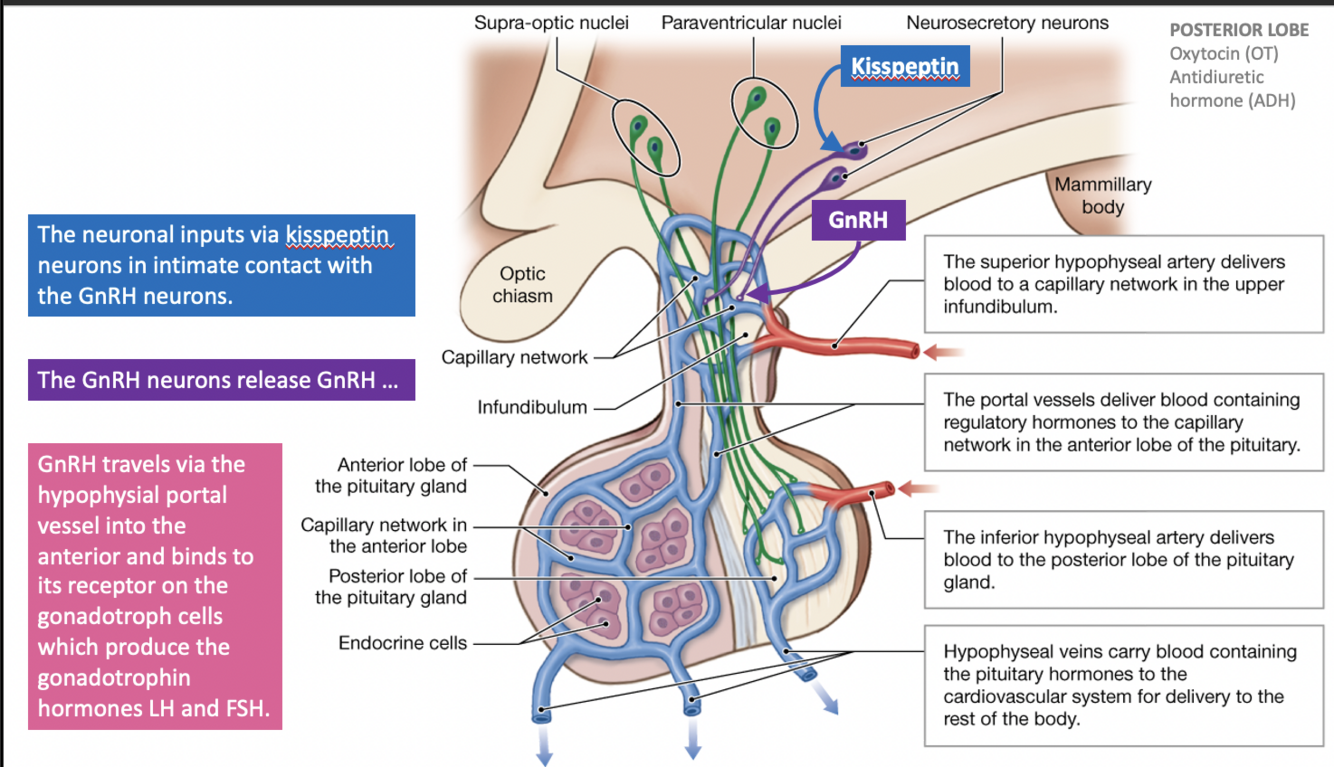 GnRH travels via hypophysial portal vessel –> anterior pit and binds to gonadotroph cell receptor –> prod. LH & FSH