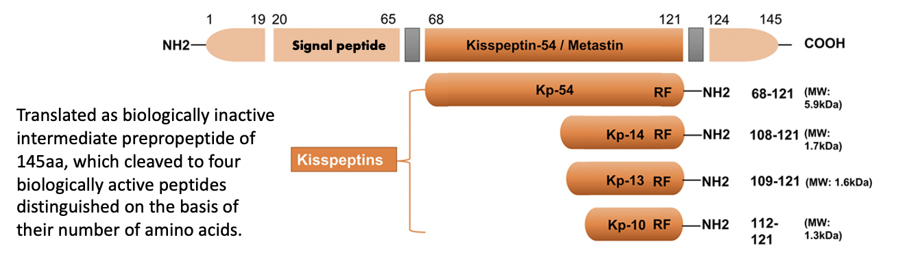 Kisspeptin is translated as a biologically inactive intermediate of 145 amino acids, which is cleaved to 4 biologically active peptides