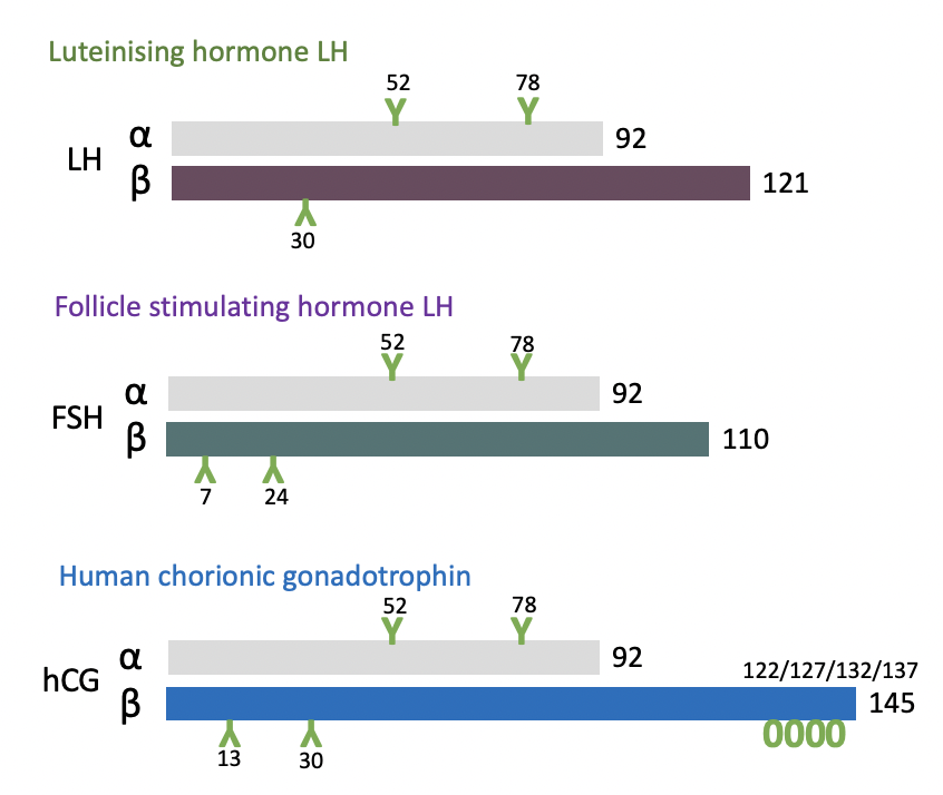 Gonadotrophins= heterodimeric peptides, consist of a common a-subunit and a hormone-specific beta subunit