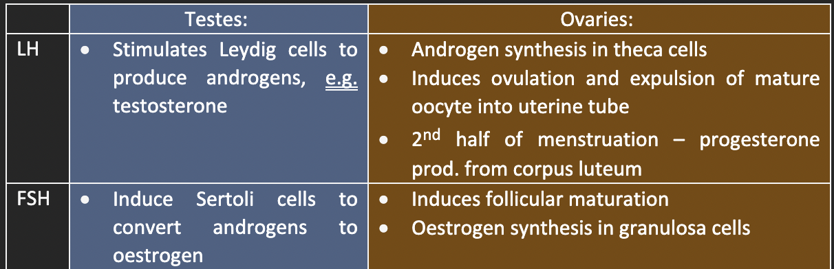 Compare how gonadotrophins act in the testes vs ovaries