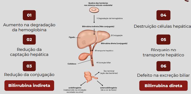 Fisiopatologia (Step 1): A inflamação e o edema dos hepatócitos causam: 1) Disfunção da membrana basolateral (reduzindo a captação); 2) Dano ao retículo endoplasmático (reduzindo a conjugação); e 3) Compressão dos canalículos biliares pelo inchaço celular (bloqueio no transporte/excreção), o que faz a bilirrubina já conjugada regurgitar para o sangue.