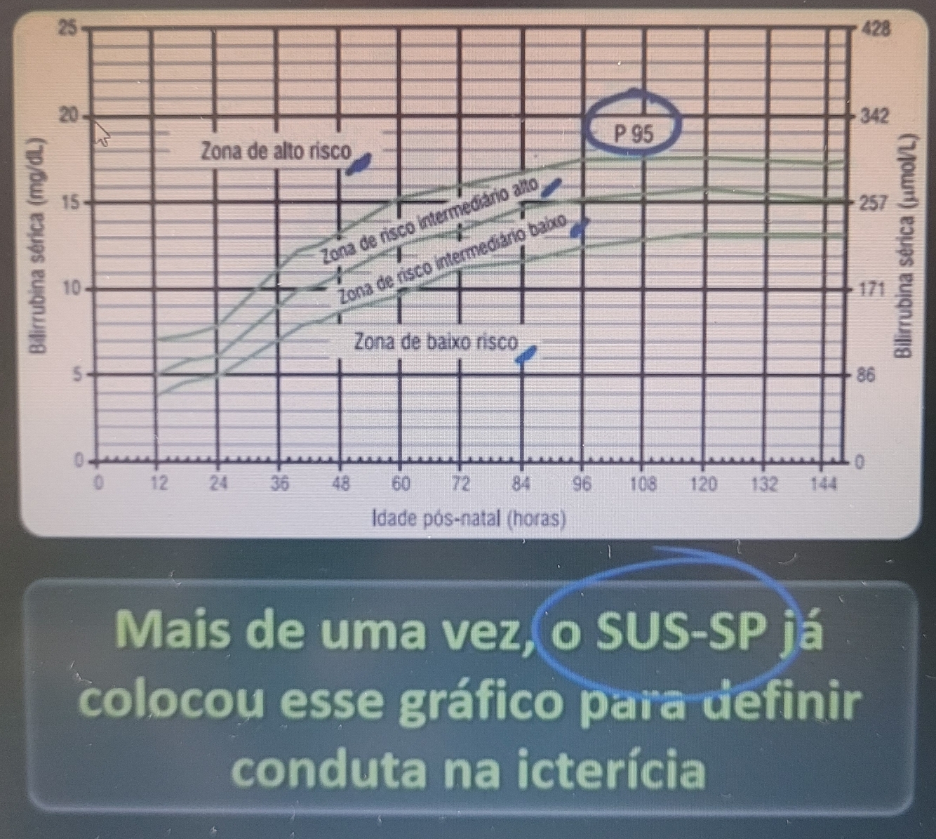 Gráfico de BHUTANI avalia o risco futuro que o paciente vai ter por conta da hiperbilirrubinemia, indique as zonas e as condutas