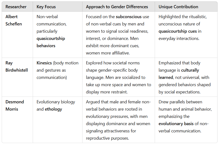 Unique Contribution: Scheflen emphasized the ritualistic and subconscious nature of non-verbal behaviors, including how both genders use body language to navigate complex social and power dynamics, even in non-romantic contexts. His analysis of quasicourtship behavior focuses on how both genders use signals that resemble courtship behaviors but are used for broader social purposes, including bonding and affiliation.