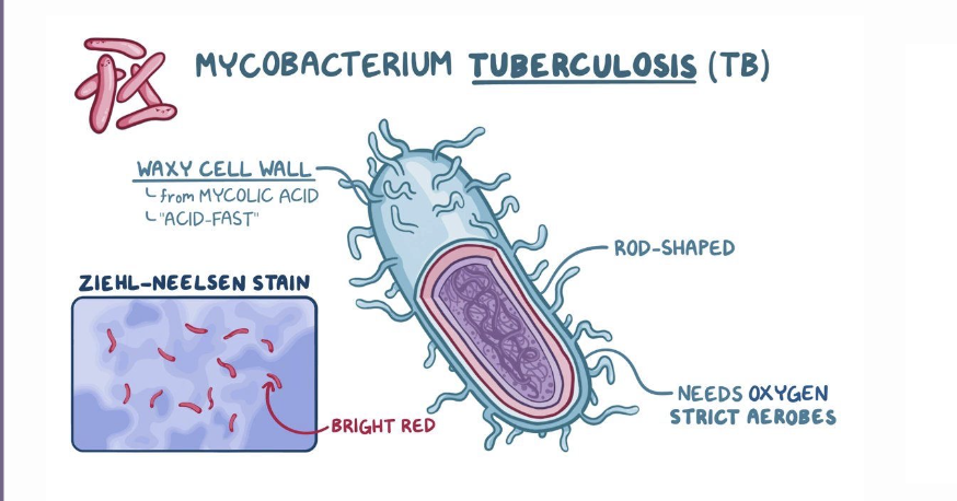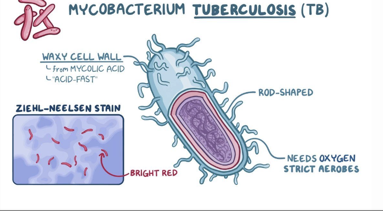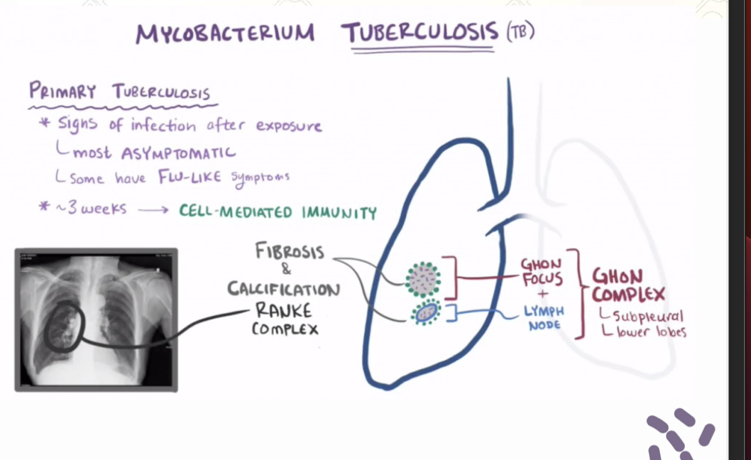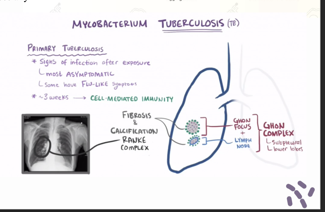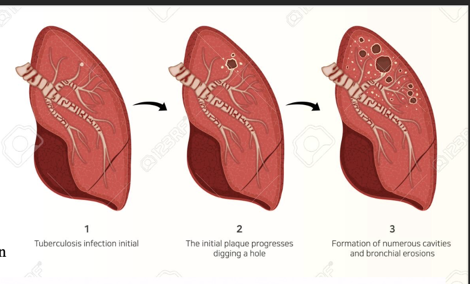 - causes tissue necrosis, granulomas, cavities (usually found in upper or middle lobes)