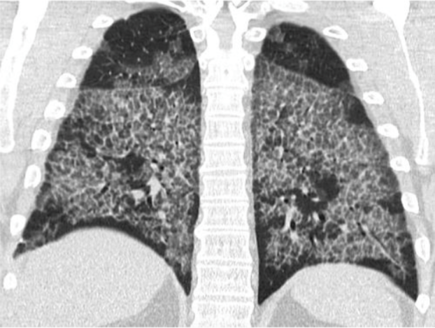 Crazy-paving: more central; CXR also w/ hyper-dense opacification