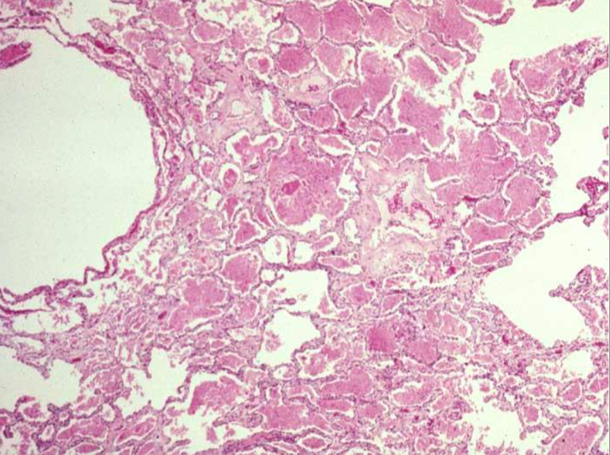 Alveolar spaces filled w/ pink lipoproteinaceous surfactant, w/o inflammation and architecture preserved