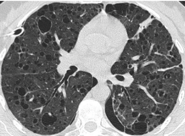 How does Lymphangioleiomyomatosis (LAM) appear on CT?