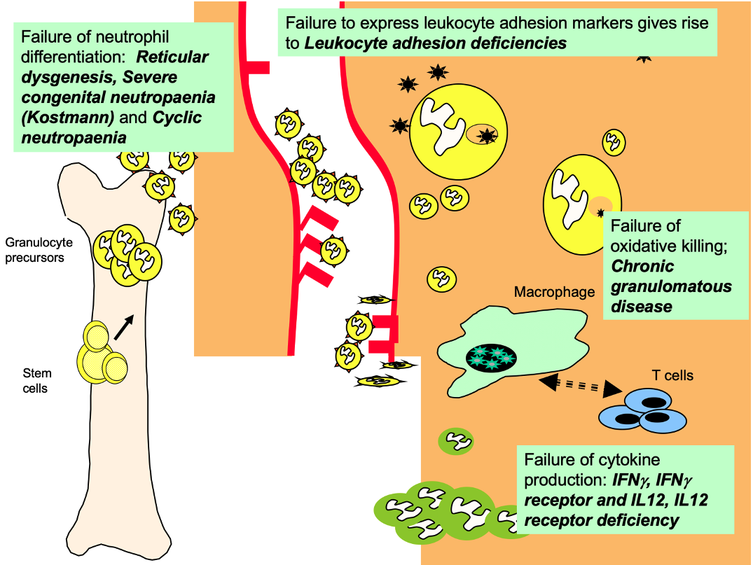 No CD11a/CD18 and CD11b/CD18 → failure to bind to ligands on endothelial cells → failure of neutrophil adhesion/transmigration → neutrophil accumulation in blood