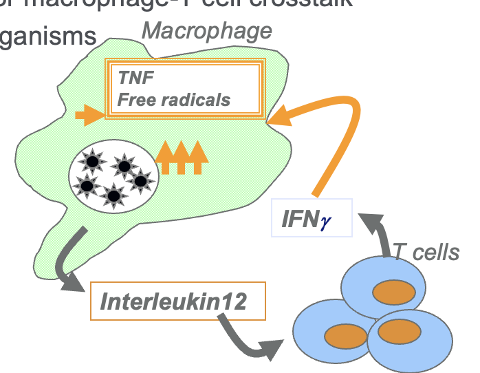 Infected macrophage → IL-12 → T cells secrete IFN-gamma → feeds back to phagocytes → TNF production → NADPH oxidase activation → oxidative pathway stimulation