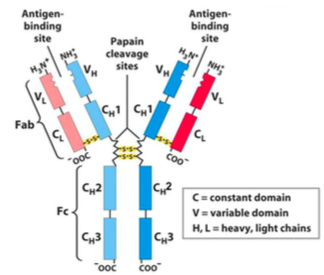 The heavy chain has the 3 constant domains (CH1-CH3) and 1 variable domain (VH); defines the class of immunoglobulin