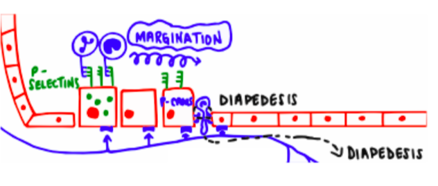 Catches the white blood cell and prevents them from flowing pass the area -> these white blood cells will go from selectin to selectin, rolling on the endothelial cells - margination.