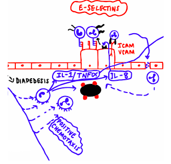 • IL-1 and TNF-α -> act on endothelial cell and stimulate production of E-selectins -> allow for monocytes and neutrophils to adhere with E-selectins.