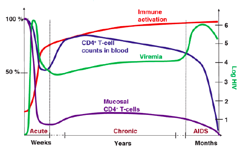 Outline the changes in Mucosal CD4 T cells, CD4 T cell counts in blood, Viremia and Immune activation in HIV over weeks, years and months.