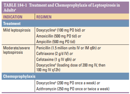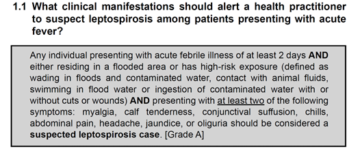 In cases with strong clinical evidence of infection, a single antibody titer of 1:200–1:800 (depending on whether the case occurs in a low- or high-endemic area) in the microscopic agglutination test (MAT) is required.