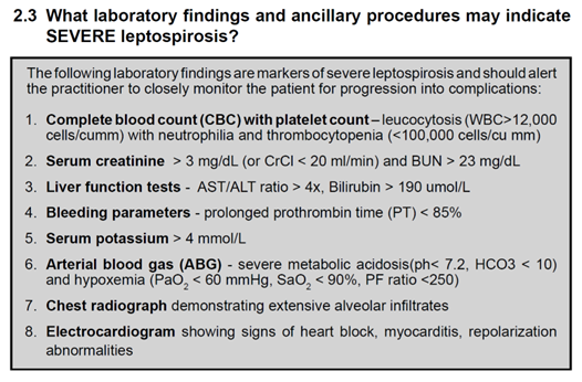 Based on CPG what are the lab results that may indicate severe leptospirosis?