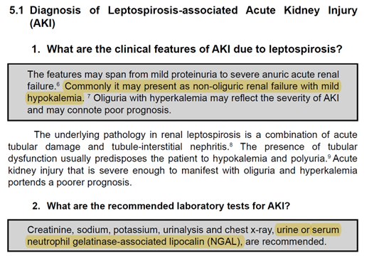 Based on CPG what are the recommended tests for AKI in leptospirosis?