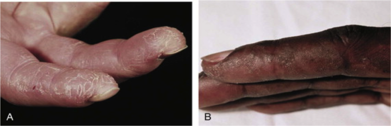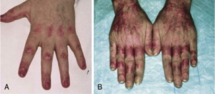 A = Dermatomyositis; Note the changes on the knuckles and dorsum of the hand (Gottron’s sign)